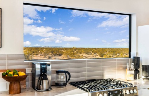 Step into your own secluded world. The interior of our property is thoughtfully designed to create coziness and well-appointed living spaces with unique elements that create a warm and inviting atmosphere. Unwind in style while enjoying the desert's natural beauty from every window, this inviting oasis is only 14 minutes from Joshua Tree town, shops, and local restaurants.