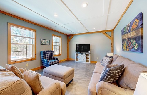 A comfortable perch for Maine adventure, this wood-lined duplex is minutes from multiple lakes, forests, and local shops. Showcasing a spacious open layout full of sunlight, the interior of the duplex maximizes family time. The living room's ample seating and large smart TV lend themselves to movie nights, whereas the well-equipped kitchen makes mealtime easy with granite countertops and stainless steel appliances.