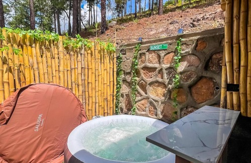 Jacuzzi exterior privado con vistas panorámicas a las montañas y al atardecer