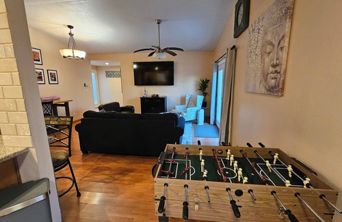 Consider this house your home away from home while you visit Las Vegas. This superb property boasts 4 bedrooms, including 1 king bed, 2 bunk beds, 2 twin beds, and 1 queen bed, ensuring ample space for all guests. The 2 bathrooms are equipped with a bathtub, shower, and hair dryer for your convenience. With AC, WiFi, heating, an iron, washing machine, and hair dryer, all your needs are taken care of. Plus, there's an additional living room with a cozy sofa bed. We hope you'll enjoy your stay at our fantastic house.