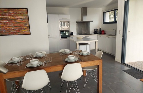 Superb newly built architect's villa (built in 2013) on enclosed garden of 400m2, facing Teven beach. Only the customs path separates the villa from the beach. Living space: 144 m2. Parking cars under the carport at the back of the house. Exp. South