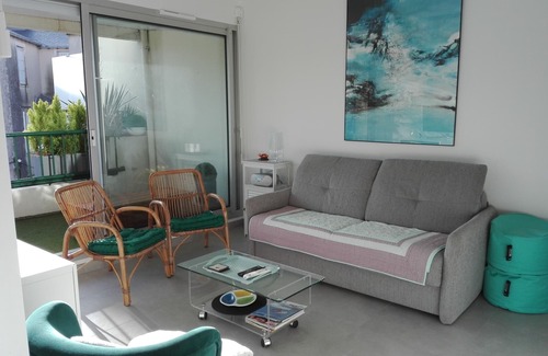 High-quality, 62 m² apartment in perfect condition - all mod cons - with air conditioning in a small, quiet residence, sleeps 2 to 4. 2nd floor with elevator. 100 m from the Grande Plage center, 100 m from the covered market and the town center. Two bedrooms with closets. Two bathrooms (one with a washing machine). One separate toilet. A 17 m² dining room with an open kitchen (induction hob, refrigerator-freezer, microwave, dishwasher). A 13 m² living room with a flat-screen TV. Air conditioning. Two large south-facing windows open onto two small terraces (6 m² x 2 m²). Parking in the residence is an additional charge: €50/week.