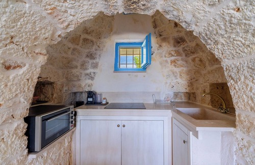 The ancient trullo, completely renovated and made comfortable with all modern accessories, offersup to 4 beds: entrance into the living room withdouble sofa bedand kitchenette,double bedroomand full bathroom with shower.