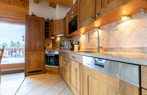 3*+ cocooning 110 m2 apartment. Sunny living room in the summer with sofa bed and fireplace, balcony and terrace, TV and WiFi. Open kitchen with fridge and freezer, dishwasher, oven, microwave, Nespresso coffee machine (capsules not included), kettle, toaster, citrus press, cheese fondue set and raclette machine.