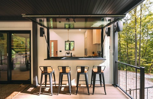 2nd Floor – Chef's Kitchen, Living room, Bedroom (Queen bed), Bathroom, Deck with mechanically lowered pergola featuring: Indoor/Outdoor Bistro, Dining Table Gas Grill, Pizza Oven, Outdoor Shower, Hot Tub for 6 people, and Porch Swing