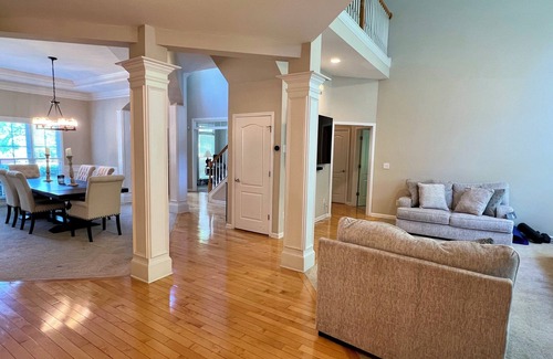 The main level has an open floor with huge high ceilings and one bedroom. The great room is the centerpiece of the home which features large windows, a double-sided fireplace, and a 360 movie cinema. Wake up and enjoy brunch in our country-style breakfast room and dinner in our formal dining room with a beautiful full-size dining table. Our deck offers privacy for relaxing.