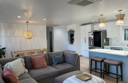 This home has everything you need. Clean and contemporary. We supply a full kitchen, and all the bedroom and bathroom linens and supplies for your time here. There are board games, videos and two large smart televisions as well. It is a 1/4 mile walk to 101 with the downtown businesses and 1/2 mile walk to the beautiful marina. The yard is very simple with table and chairs and a grill. No pets and no drugs or smoking allowed on property.