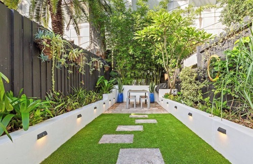 Enjoy garden views in the second dining room from a plush cushioned bay seat, four-seater table or charming reading chair. With your morning coffee and favourite book in hand, open the French doors to a private courtyard. The feature-lit lawn with a bamboo backdrop sets a serene green scene for alfresco dining offering an electric BBQ.