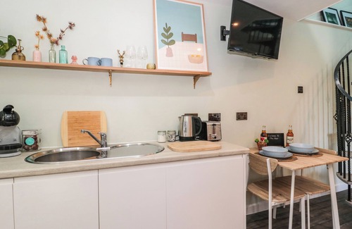 Amenities: Air-source central and underfloor heating. Electric oven, 2-ring induction hob, fridge, dishwasher. Free WiFi, Smart TV. Fuel and power inc. in rent. Bed linen and towels inc. in rent. Off-road parking for 1 car. Enclosed decked area with furniture, hot tub, and secure bike storage. Two well-behaved dogs welcome (please do not leave them unattended). Sorry, no smoking. Shop 0.5 miles, pub 0.8 miles, River Severn 1.8 miles. Note: Due to the spiral staircase, care should be taken at all times. Please note: This is a adult only property. Please not the property is not suitable for those with mobility issues