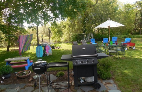 The Backyard: Hammock * Bird Feeder * Feels private * Outdoor shower * Propane Grille with backup tank * Patio table and chairs.