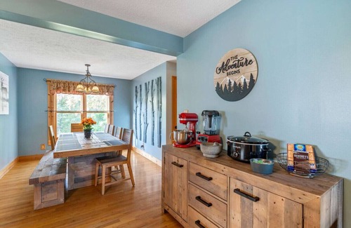 Step inside to the gathering core of the cabin: a bright, open kitchen and dining area designed for connection. The farmhouse-style kitchen is fully stocked with cookware, bakeware, and serveware for everything from big breakfasts to holiday dinners. Stainless steel appliances, generous counter space, and a large island make it easy to cook together, while bar seating invites company during meal prep.