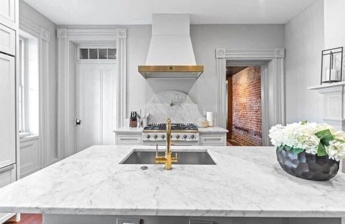 The first level of the home consists of a light-filled drawing room (also called the Morning Room in older Charleston days), a rustic exposed brick dining room that resembles a wine cellar, and a renovated kitchen with a luxury La Cornue gas and electric range, Carrara marble countertops, and custom cabinetry. The powder room is located off the kitchen.