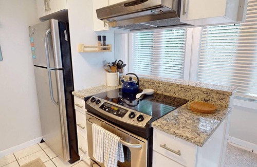 The condo is the perfect place to rejuvenate. Spend your days on the back porch overlooking a pond surrounded by lush greenery. Enjoy your evenings in the living room which features a full wet bar. The kitchen is fully stocked with appliances and has a dishwasher for guests' convenience. There is a breakfast nook as well as bar stool seating. Three guests can sleep comfortably between the king bed and the sofa bed in the living room. The bathroom has a shower/tub combo and a double sink vanity. There is even an additional makeup station. There is a laundry room beach chairs, boogie boards, and beach towels for guests' use.