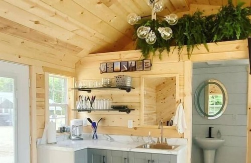 Enjoy a beverage under the lights on the patio, roast marshmallows over a fire, read a book, hike, enjoy lake views, swim, or kayak, and more! This tiny home includes a queen bed and a twin trundle. The 240 sq ft also has a 3-piece bath & kitchenette.