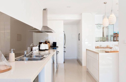 Spacious open plan living / dining area with a very well fully equipped kitchen including dishwasher, DeLonhgi (Nespresso) coffee machine, island bench with wine fridge, Wifi and smart TV which is all located on the lower two levels.