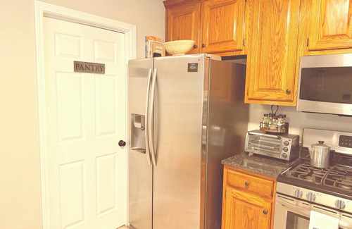Fully stocked kitchen - includes coffee and tea stations - for family dining. Microwave, toaster oven and many other appliances makes it fun to cook together! Farmhouse dining table is spacious with 6 chairs.