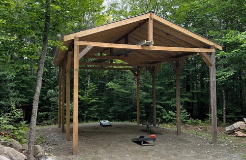 We have a campsite near Lake George in Skowhegan and we added a few sites to share with friends and family. This is a cozy cabin ideal for a family who want to get away and enjoy the outdoors. There’s a small fridge to keep your drinks cold and an air conditioner to keep you comfortable on warm days. There’s a fire pit with a grill for cooking. Onsite there is a communal bath house and a covered pavilion. This campsite is just a short trail walk from the Lake George regional Park. Which has a couple of beach areas as well as a boat launch for water sports. There’s a bathhouse to shower and clean up. We are working on getting the septic system installed and have a portable toilet to use until it’s completed. From the campsite you can take a 10 minute walk down to the lake or you can spend the day hiking. You can drive down to the boat landing and put your kayak in the water or continue up the road to enjoy a nice sandy beach.