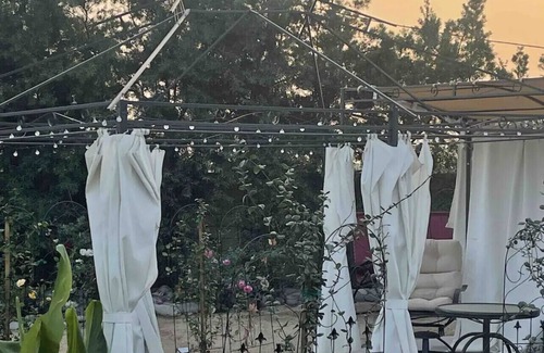 The Peacock House is a spacious guesthouse in the backyard of a 1/2 acre lot. In the front is the main house occupied by the owner and host. There is plenty of privacy as the guesthouse is a standalone structure with no shared walls. It also has a private side-yard accessible from within the guesthouse. There are 2 beds, king and full sized in different corners of the guesthouse that can sleep upto 4 people. The bedroom areas have privacy curtains which give a cozy enclosure when needed.