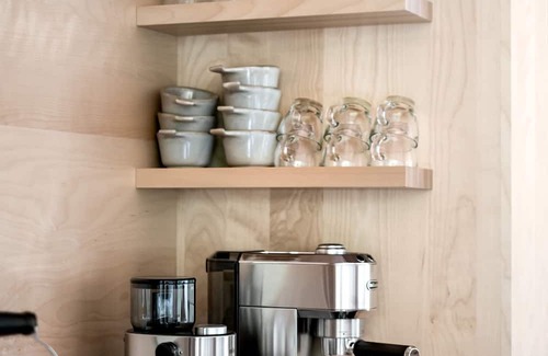 You'll find a fully equipped kitchen at the heart of the space, an indoor sauna, and a traditional wood stove. The mezzanine bedroom is designed for sleeping close to the trees. Outside, a terrace and a fire pit are arranged for late-night conversations. The chalet can accommodate up to three people.