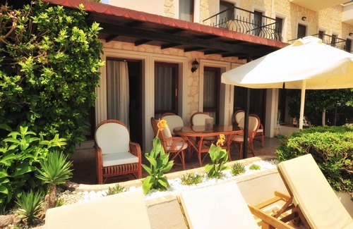 The Teras Apartment is on the exclusive, small, Emir Development which has wonderful views of the bay of Kalkan. The ‘old town’ is a five minute walk away. This air conditioned luxury two bedroom apartment is located on one floor at pool level in a prime location. It has the largest furnished covered veranda (20 sq.m.) in the complex which keeps the interior of the apartment cool. The private terrace is accessed through French doors from the lounge and a door from the master bedroom. There are two shared swimming pools, a children's pool, spacious sunbathing terraces with loungers and umbrellas. The Teras apartment is decorated and furnished to a very high standard featuring stone walls, antique marble floors and large windows. It includes all the facilities you would expect to find in high quality accommodation, such as black granite topped tables and worktops, water cooler, 32" LCD TV with internet giving access to a large numbers of programmes and a DVD player, cable internet, high quality kitchen equipment and a safe. There is an English speaking manager who lives on site along with other staff and she will assist guests with any problems, booking taxis, arranging for a take away delivery, etc. The rental permit number is 07-267