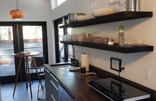 This beautiful designer house is packed with rustic charm and modern style. Bright, airy with touches of art. You will enter the home through one of three full glass French doors. When entering you will immediately get the idea that a lot of time and heartfelt thought went into making this your home away from home. The deep dark saw cut timber shelves and the fully stocked coffee bar on your left is accented by the view through the large glass panel that shows off the impeccable tile work for the spa shower. Turning left you enter into the galley kitchen which boasts an 8 foot walnut butcher block top. Under that is a Sharp microwave drawer, (cool huh) and a small refrigerator. There is also a 2 burner induction cooktop with a full array of cookware provided. The sink is easily a foot deep and has a 1hp disposal at the bottom of it.