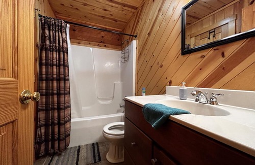 Head up stairs or check out the main floor bedroom with a full-size bed and connecting bathroom. You get to choose what to do first. When you make it upstairs to explore in the loft area you will find a couch and tv. When it’s time for bed just take off the cushions and pull out the bed making more room to sleep. Sofa bed not your thing that’s ok as there are two bedrooms up here to choose from. One bedroom with a full-size bed and the other with a queen bed. No need to run downstairs to use the bathroom just use the full bathroom upstairs. Be sure to take your swimsuit in there with you so you can go explore the beach area at the lake!!