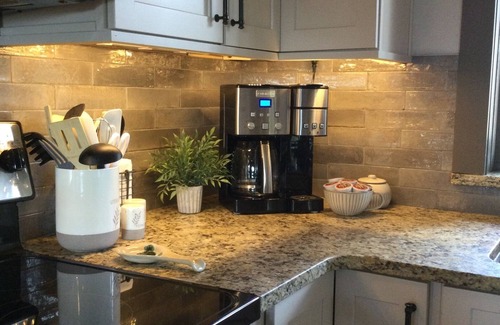 The gourmet KITCHEN features all new stainless steel appliances, leathered granite countertops, designer cabinets, ambient lighting, and a handy breakfast bar with seating for 4. You'll find everything you might need in this well-appointed kitchen including an Instant Pot slow cooker/pressure cooker, Cuisinart toaster, Cuisinart dual coffee maker (which accepts single-serve Keurig-style coffee pods as well as ground coffee for making a full carafe), a blender, a full set of T-fal stainless steel pots and non-stick pans, a variety of bakeware, and all kinds of cooking gadgets and necessities, as well as basic pantry items, paper goods, and linens.