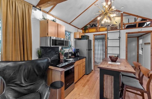 Amazing Large feel tiny house with soaring 16' cathedral ceiling! Master bedroom has a Queen bed with new luxurious Nectar mattress & fine linens. Second bedroom is a loft with a new Full sized Hybrid memory foam mattress & a futon could sleep a smaller child. Huge deck with dining table & sectional overlooks the large firepit & lake. The kitchen has a full sized refrigerator, new stove & microwave, with all the dishes needed to prepare a large meal! Stackable washer/dryer is provided as well.