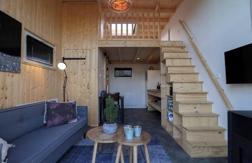 Tiny House 2 may be small, but it has a very clever layout which gives it a feeling of space. The house has all the facilities you need and is suitable for 2 people. The living room of the tiny house is warmly decorated with natural materials and has a cosy sitting area with television. There is also a pellet stove. The open-plan kitchen is equipped with a combination microwave oven, cooker and coffee-pad machine. Via a staircase you reach the sleeping floor with a double bed. Furthermore, the Tiny House has a bathroom with shower and toilet. Outside you will find a sunny terrace with garden furniture. Together with other tiny houses, the house borders an open-air courtyard with lounge sofas, hammocks and a (shared) hot tub* where you can enjoy yourself.