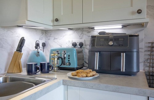 The bright and modern kitchen is fully equipped with everything you need for a family getaway or a quiet couples' retreat. It includes an electric oven and hob, microwave, fridge, freezer, and dishwasher, ideal for cooking up your favourite meals with ease.