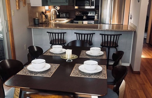 Dine in the kitchen’s adjacent dining area at the table for 6. Cook and dine outside on the propane grill (host provides propane) or sit on the outdoor furniture with a drink. You’ll love the deck for relaxing in the fresh air and enjoying the peace and quiet.