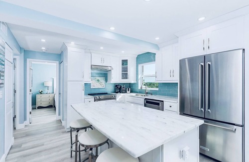 Kitchen: Sunny, fully stocked kitchen with new KitchenAid appliances. (Range, stove, double sink with window, refrigerator w/ice maker and purified water dispenser, dishwasher and Sharp drawer microwave built into the island.) All kitchen supplies are new. Small appliances include a Keurig coffee maker, a traditional coffee pot, espresso machine, air fryer, Cuisinart blender/food processor, four slot toaster, crockpot, and hand mixer. A countertop NuWave oven is also provided which is nice in the summer when you do not want to use the oven.