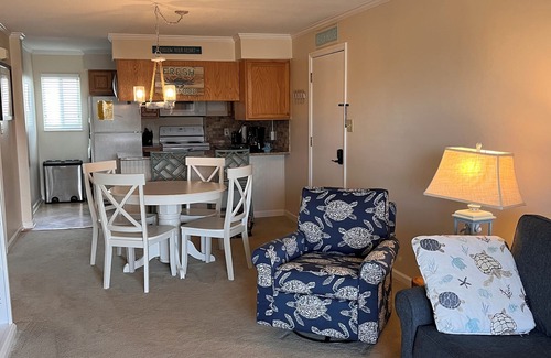 Third floor condo villa with amazing views off a private balcony with table and chairs. Well-maintained and loved cozy vacation space with recent upgrades to both bathrooms and the main living room. Turtle-theme carries through the living room, bathrooms, and even the kitchen. Each bedroom has a smart TV as does the living room. Primary bedroom has king sized bed, private bathroom, and beautiful views. Secondary bedroom has a twin bed and twin bunk bed, and direct access to the tubbed-bathroom. Condo building is second to the beach with easy access via boardwalk or ramp. Each access point has a shower/rinse station. Roughly 1 mile to the Point. Paved path outside of complex that goes for miles along Coast Guard Rd and 58 and is great for long walks, runs, or biking. Close to shopping and restaurants including Gaffer's and the Village ice cream shop (which should be visited just for the amazing smell!) Condo complex has five smaller buildings - it is a quiet and peaceful, gated community. There is also kayak storage, bike racks, a basketball court, and a tennis/pickleball court. Property is professionally maintained and landscaped and you will likely spot our local deer, bunnies, and freshwater turtles. Villa also overlooks one of two property pools. Two paved parking spots (any available in lot). Building does not have an elevator (the view is worth it- especially when the dolphins are jumping!)