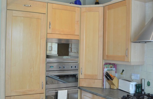 The living room is a bright sanctuary, adorned with original Georgian features and lofty ceilings. Sink into the comfort of our large sofa, bask in the warmth of the fireplace, or explore our custom-built floor-to-ceiling bookcase. For added flexibility, a pull-out bed awaits, perfect for families or friends seeking extra comfort.