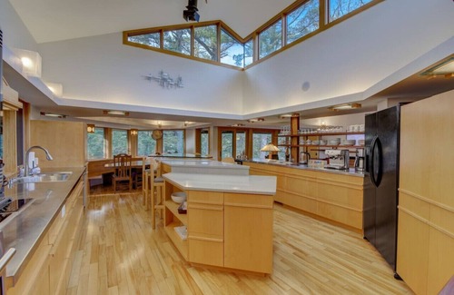 Kitchen - The kitchen has so much natural light from all of the windows. It is equipped with Wolf appliances, including an induction stove top. We have stocked everything you need to prepare meals and drinks. You only have to bring the food. We have an espresso machine, drip coffee pot, and all of the pots, pans, and other accessories you need. Plenty of seating, to make this a social hub in the house and open to the family room.
