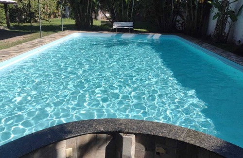 1800 m2 totally green area; 180 m2 house; 600 m2 leisure area; covered external area for parties/games (pool, ping-pong, etc) for rental; 100 m2 pool & deck (with internal illumination for special events), swimming pool bar; electronic gates; parking lot for 15 cars: 2 covered slots; wonderful view; Accommodations capacity 10 persons in beds, plus 10 in comfortable floor mattresses (the external area can also be used for camping (up to 14 people, with personal tents), with 2 external bathrooms (1 with shower), bar, 2 freezers, big churrasco grill. Aside domestic oven, industrial oven; DVD); Wi-Fi; telephone: to be arranged