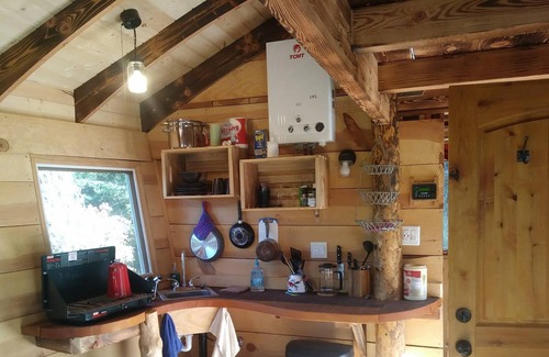 This completely off the grid Treehouse has solar energy (but does have a backup generator), a water catchment system allowing the guttering around the tin roof to collect all the water needed and then it deposits into an 850 gallon tank. Bathroom with shower and toilet situated at the back of the Treehouse, with an adequate kitchenette in the living area leading to comfortable seating with an old 19th century (circa 1865-1875) wood stove we found from a railroad, and then you have two huge double patio french doors that lead you out on to the decking to just simply enjoy those wonderful surroundings. This is an all season TreeHouse so snowshoes are necessary in the winter time to get to the TreeHouse.