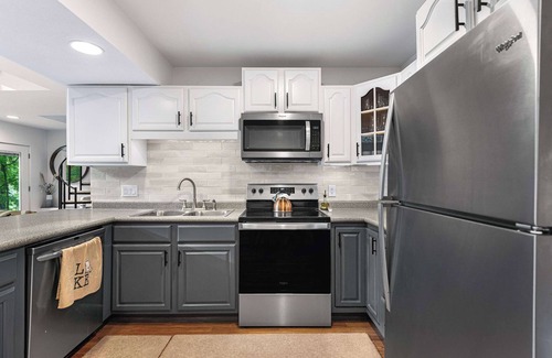 Indoors, soaring vaulted ceilings sit atop open spaces illuminated in natural light from the floor-to-ceiling windows and offering sweeping views of your forested surroundings. At the end of long days on your feet, sink into plush living room sofa seating while you queue up a new movie or your favorite shows on the smart TV. Steps away, the modern kitchen showcases stainless steel appliances, and ample cabinetry stocked with cookware and dining ware. Four stools at the counter as well as a high-top table for 2 can seat the whole crew for formal meals and more casual bites alike.