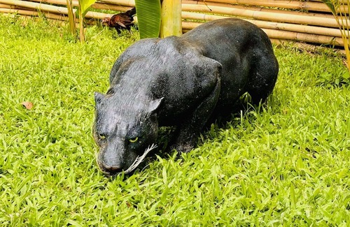 Hot Jacuzzi: Unwind in the hot jacuzzi, nestled in a tranquil garden corner adorned with unique Moai statues, enhancing the exotic ambiance.