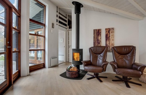 Typhouse built from the best materials. The house is tastefully and beautifully furnished. 2 beautiful bathrooms, one of which has whirlpool and sauna. There is underfloor heating in both bathrooms. Comfortable living room with tasteful furnishing and a nice and well equipped kitchen. From the living room there is exit to the large terrace where you can enjoy the sun from morning till night. The house is located in beautiful natural surroundings and close to the subtropical water park Lalandia. A good and solid house which can be used all year round. Many TV channels can be received.