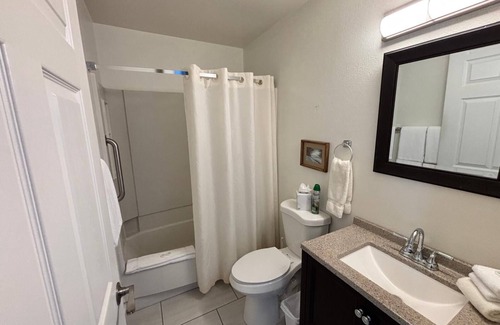This cozy two-bedroom, two-bathroom condo features a gas fireplace in the open concept living, kitchen, dining room with sliding glass door leading out to your private patio. The master bedroom has a queen bed with a full en suite bathroom, TV with free cable and private patio. The second bedroom has two twin beds, a private patio and a full bathroom just outside the door that is shared with the queen sofa sleeper in the living room. Both bathrooms include a hairdryer and a selection of bath soaps. The 1st floor corner unit has a fully equipped kitchen that includes a full-size refrigerator, oven with range top, microwave, drip coffee maker and more. This unique resort property combines the space and conveniences of a two bedroom condominium with many of the amenities and services frequently found in a hotel setting.