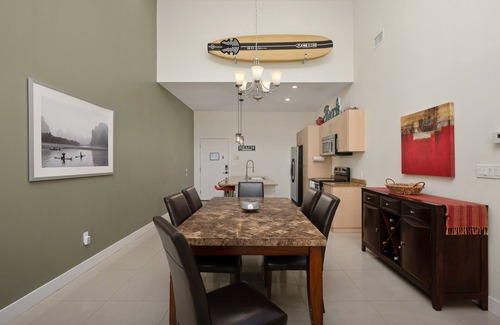 The master bedroom at this condo entails a Queen bed, TV, and private en suite bathroom. The en suite bathroom entails a tiled walk-in shower and double vanity sinks. The second bedroom entails a twin over full bunk bed and a TV. Both bedrooms have spacious closets. A second full bathroom can be found in the common area. The condo has a fantastic main living area that's open and spacious, making it perfect for entertaining friends and family. The kitchen has nice granite countertops, stainless steel appliances, a huge island, and is fully stocked with all the kitchenware you may need to prepare an appetizing meal.