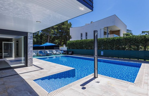 Villa "Rial 2", 2 storeys. 500 m from the centre of Fažana, 250 m from the sea, 250 m from the beach. Private: property 400 m2 (fenced), swimming pool (11 x 5 m, 60 m2, depth 140 cm, seasonal availability: 01.May. - 01.Oct.) with internal staircase. Outdoor shower, garden furniture. In the house: internet access, washing machine. Parking (for 4 cars) at the house on the premises. Shop 250 m, restaurant 300 m, bus stop 550 m, pebble beach 250 m. Object suitable for 8 adults + 2 children. Please note: airfield 10 km from the property.