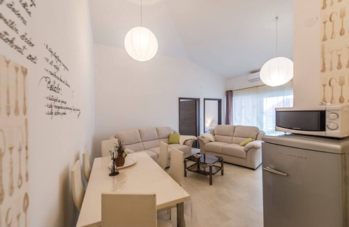 The apartment Noa No.3 is located on the first floor of the house and is ideal for families who want to enjoy a peaceful and relaxing holiday. It consists of a two double bedroom, a kitchen with dining room, a living room with sofa bed and a bathroom with shower. The kitchen is equipped with an electric stove, fridge with freezer, microwave and coffee maker. The apartment has a free wireless Internet access, air conditioning, satellite TV, sheets and towels. It also has a balcony with furniture. Guests can use the large, fenced, communal garden where are located swimming pool, deck chairs, umbrellas, outdoor shower and barbecue.