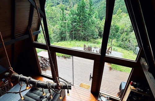 The cabin has 100m² and has 2 bedrooms, one on the upper floor and the other on the ground floor, both with a king-size bed, a mezzanine with an indoor bathtub with hydromassage, a living area and a full kitchen, a large outdoor deck with Adirondack chairs, an infinity swing and views of the mountains.