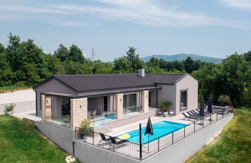 Modern, comfortable single-family house "Villa Anthea Paola", surrounded by trees and meadows. In the hamlet Frižolini 6 km from the centre of Labin, 11 km from the centre of Rabac, 6 km from the sea, 6 km from the beach, in the countryside. Private: natural state property 4'000 m2 with wildlife garden and trees, swimming pool angular, heated (31 m2, depth 140 cm, seasonal availability: 26.Apr. - 30.Oct.) with internal staircase. Outdoor shower, terrace (50 m2), garden furniture, barbecue, pool maintenance by the owner/gardener. In the house: internet access, washing machine. Parking (for 5 cars) at the house on the premises. Shop 500 m, supermarket 3 km, restaurant 500 m, bus stop 2.5 km, pebble beach 6 km. Groups of teenagers on request only. Please note: airfield 50 km from the property. Swimming pool heated (extra). It is necessary to announce 7 days in advance if the pool heating is required.