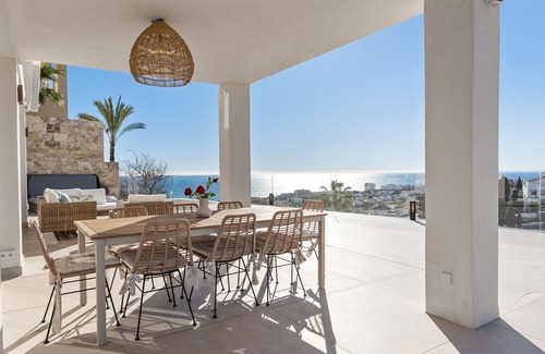 The spacious sun terrace invites you to relax in luxury. Lounge by the saltwater pool, enjoy the jacuzzi (*fee applies), or sip sunset cocktails with views over the Mediterranean and Miraflores Golf. South-facing terrace ensures sun all day and includes: