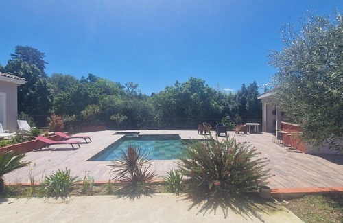 Surrounded by greenery, in a quiet area with no overlooking neighbors, you can enjoy the pool with jacuzzi as well as the large summer kitchen, equipped with a flat-screen TV (for sports fans or others), an American fridge, a dishwasher, a barbecue, and all the essential accessories for a successful holiday. A pétanque court with two sets of boules completes the large garden.