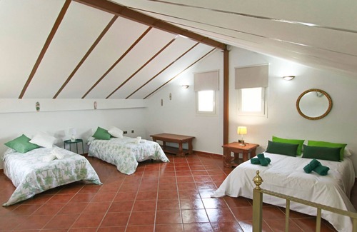 The main floor has 3 bedrooms. The main bedroom has a 140x200 bed, fitted wardrobes, large windows that give a lot of light and a ensuite bathroom, with a shower tray. The second bedroom, has two beds of 90 x 200, fitted wardrobe and windows. he third bedroom has a 140 x 200 bed, fitted wardrobes, fully equipped with a bathtub and it has windows with views of the garden and pool. On the top floor, we can find a large bedroom with 3 beds. One double (140 x 200) and two singles (90 x 200).