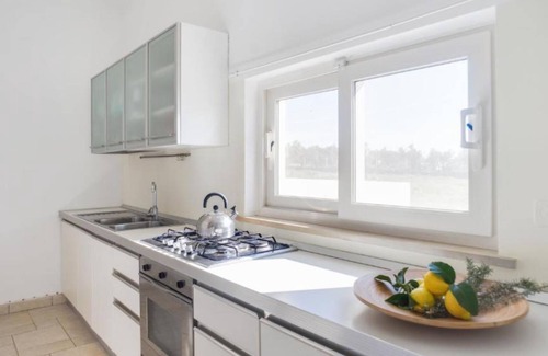The entrance opens onto a spacious, tastefully furnished living room, where traditional elements and contemporary lines coexist in perfect harmony. The large, fully equipped kitchen invites guests to gather and share moments together, with everything needed to prepare and enjoy typical Salento dishes.